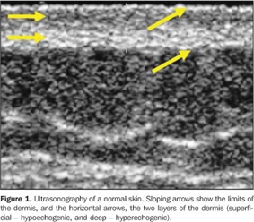 使用18MHz頻率的通用超聲掃描正常皮膚,傾斜的箭頭顯示真皮的界限,真皮的兩(liǎng)層(淺層和深層的回聲)。