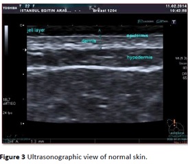 第二幅圖是日本某品牌3-18 MHz超聲掃描的皮膚圖像。D. Karacetin等“乳腺癌患者放療所緻皮膚毒性的的高分辨率超聲評價”。發(fā)表在癌症研究雜志,2016卷第4期 ,可見圖像質量比其它品牌超聲要好(hǎo)得多,但與真正的超聲皮膚影像和組織學(xué)仍相去甚遠。