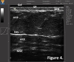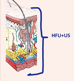 TPM DUB系統15-18 MHz掃描的皮膚圖像,清晰地顯示和測量皮膚全層的影像。Gel-耦合劑,EP-表皮,DER-真皮,HYP-脂肪,FAS-淺筋膜,MSC-肌肉