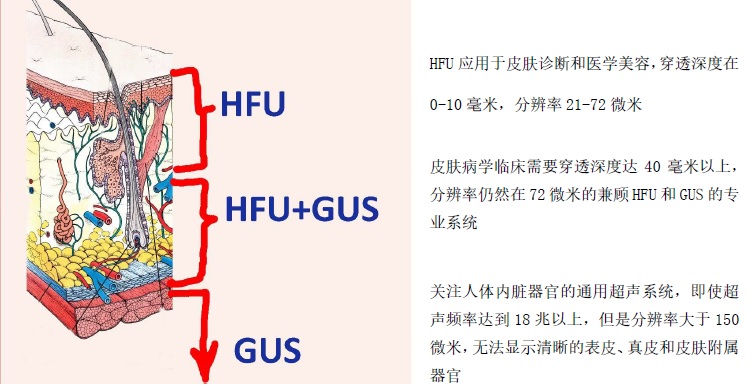 我們可以通過(guò)下面(miàn)的兩(liǎng)幅示意圖,清晰地了解高頻率超聲(High frequency ultrasound)簡稱HFU,通用超聲系統(General ultrasonic system)簡稱GUS,兩(liǎng)者之間技術差别和針對(duì)臨床完全不同的需求和功能(néng)。